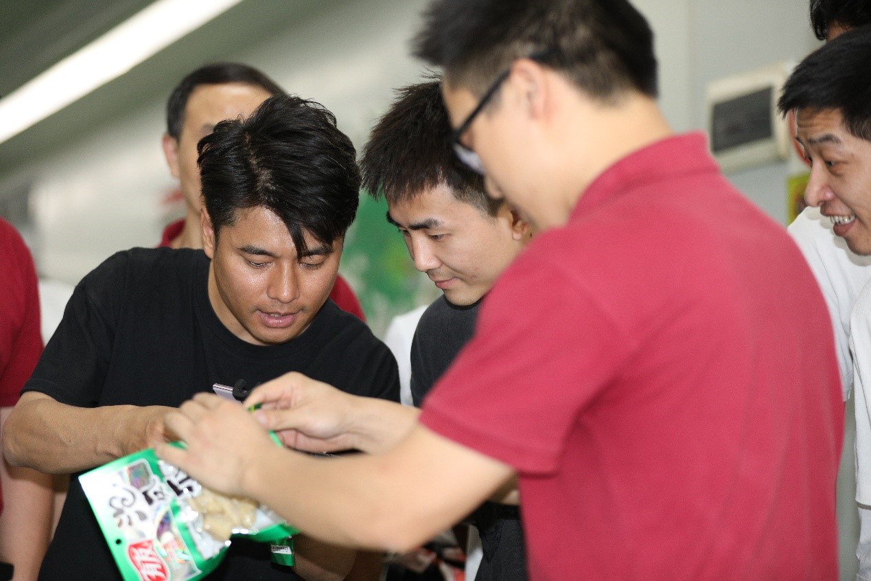 傍晚19点,篮球比赛正式开始。双方队员上场亮相, 股份公司常务副总鹿游为参赛队员送上有友新品魔鸭食客、脱油花生伴手礼。